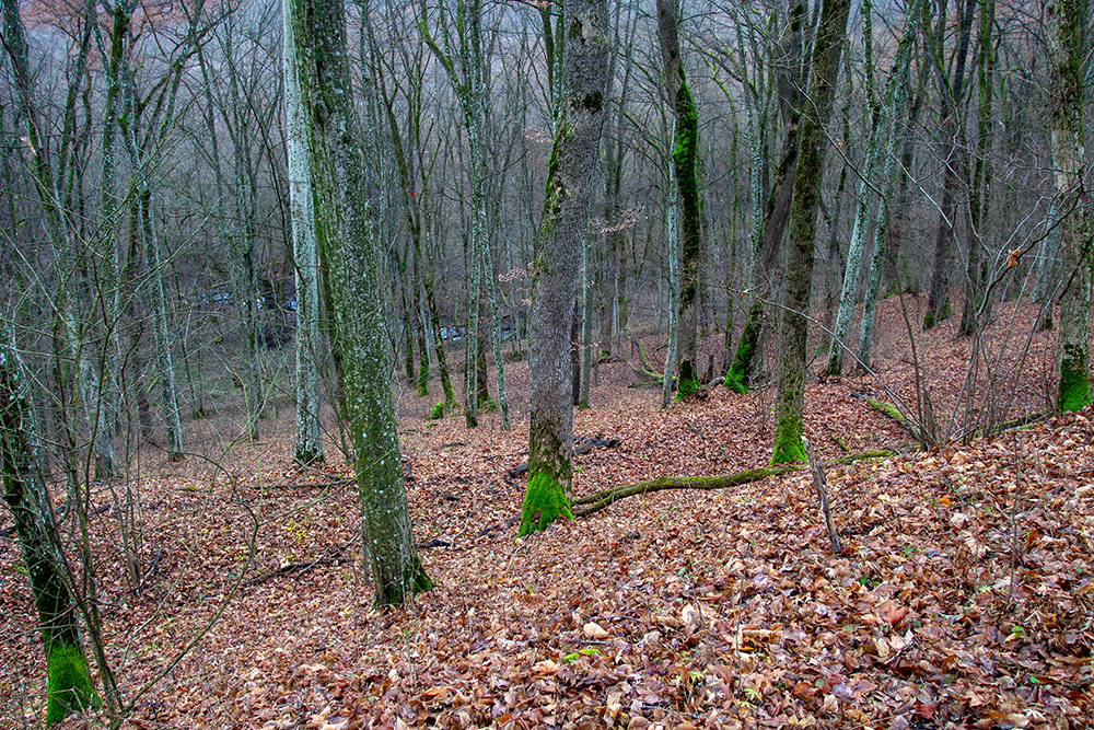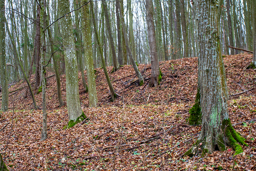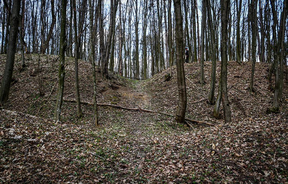 - Вигляд на долину Смотрича з гребеню верхнього валу. Насправді спуск дуже крутий і високий. Нижче видно ще три ряди валів