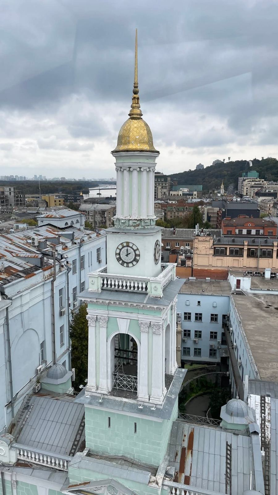 Найцікавіше, що можна побачити з колеса – це грифони прибуткового будинку колишнього греко-синайського монастиря та дзвони на його ж дзвіниці, а також саму дзвіницю – вона чудова. можна добре розгледіти Контрактову площу. А ще видно дахи навколишньої забудови і руїни Гостинного двору.