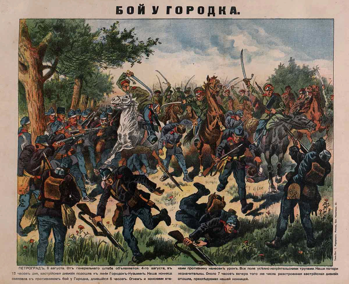 Найбільш відомим українському загалу мистецьким твором, присвяченим бою під Городком, є лубок російського художника Степана Мухарського, оперативно виданий у Петербурзі за кілька днів після події. Художник не дуже переймався питанням «Що ж там відбулося насправді?», тому зобразив, як російські козаки рубають шашками перелякану цісарську піхоту. Тобто замість гонорових гусарів у ботфортах, червоних штанях із позументом та файних синіх куртках він намалював звичайнісіньку австро-угорську піхоту.
