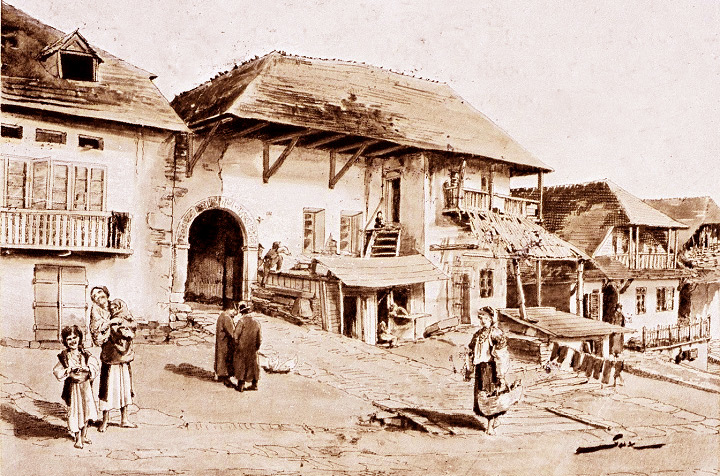 - Язловець до бомбування. В єврейському штетлі ще добре проглядаються вірменські риси. Зокрема обрамлення проїздів