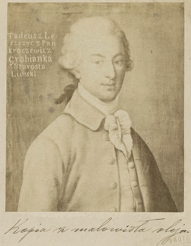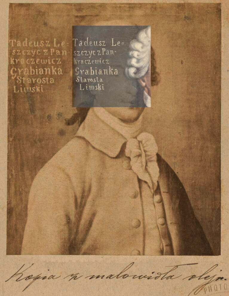 Чому від початку йшлося про копію? У верхньому лівому куті картини маємо напис: «Tadeusz Leszczyc z Pankraczewicz Grabianka Starosta Liwski» (Тадеуш Лещиц з Панкрачевич Грабянка, староста Лівський). Добре видно, що написи на оригіналі картини і на світлині Грейма досить сильно відрізняються. Особливо яскраво це видно, якщо на світлину Грейма накласти аналогічний фрагмент із львівського портрета.