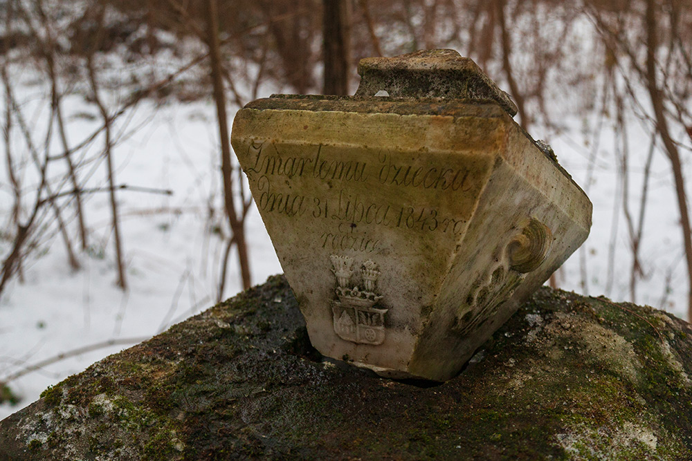 Польський напис сповіщає: «Померлій дитині від батьків. Дня 31 липня, 1843 року». Яка саме дитина — не вказано (вірогідно, все було розписано в епітафії на зниклій частині). Встановити за генеалогічними книгами ім’я теж не поталанило.