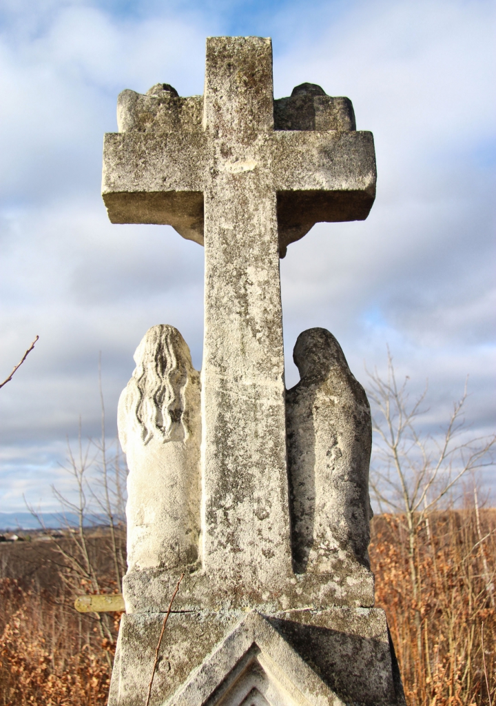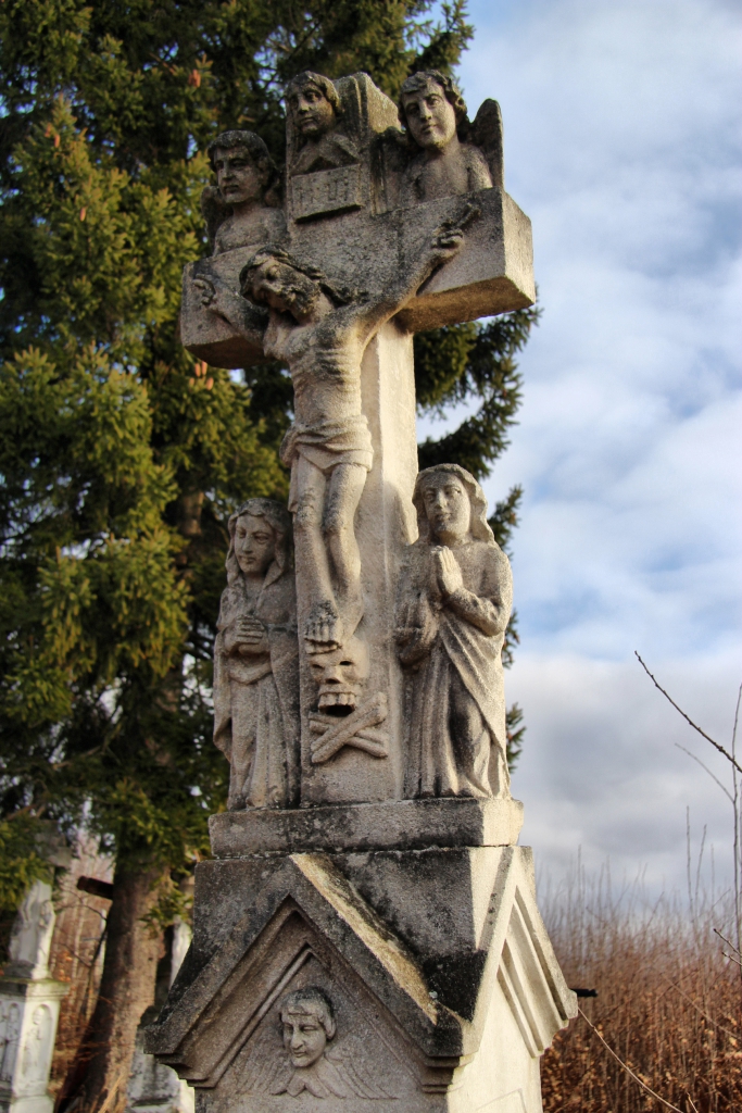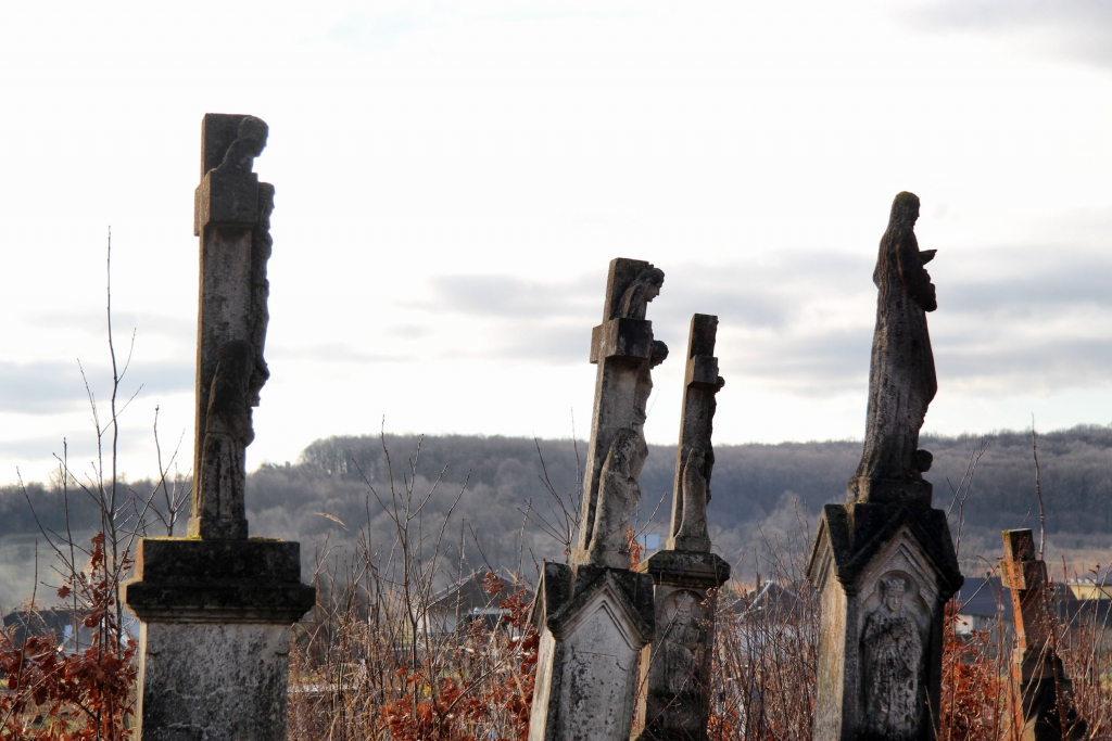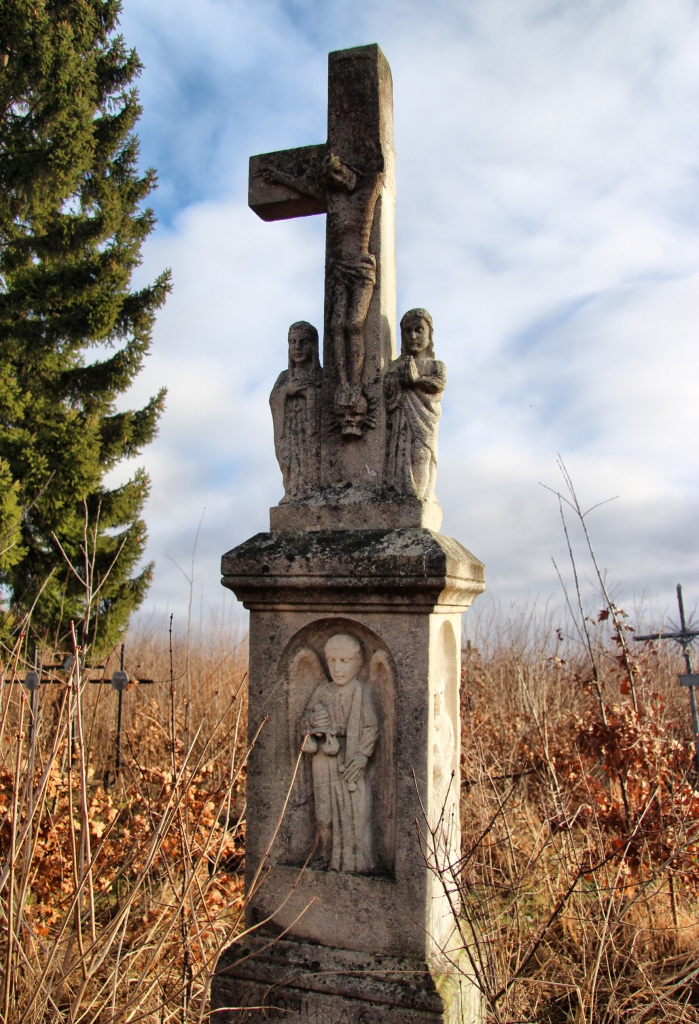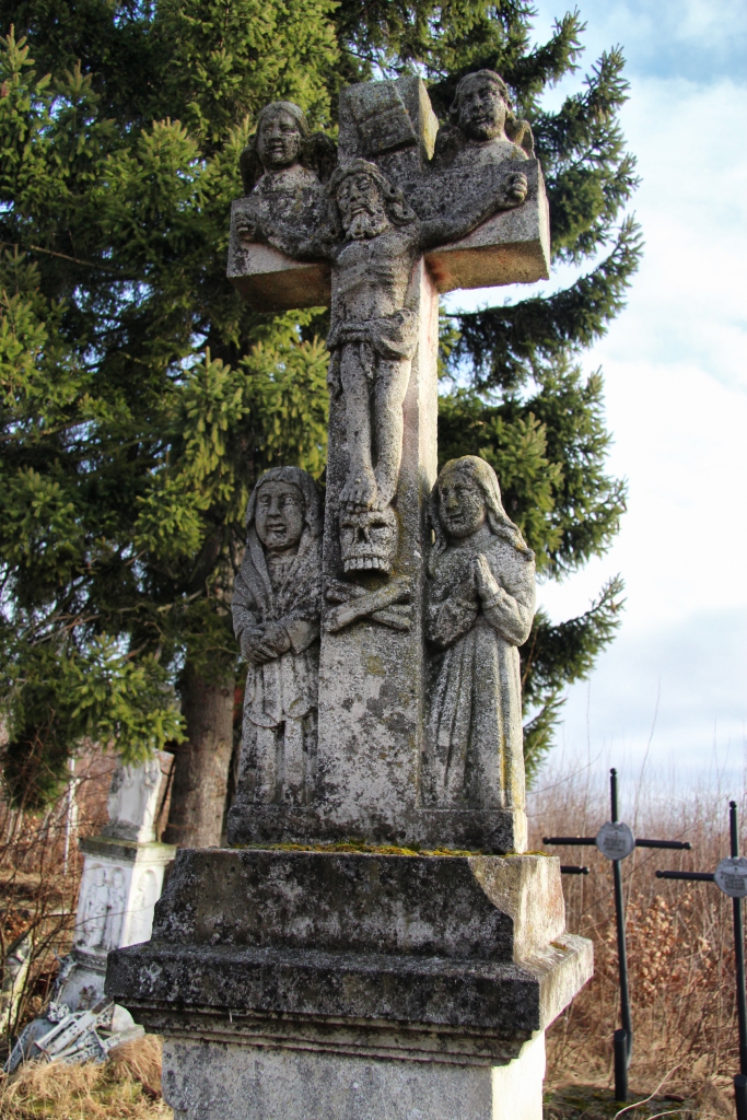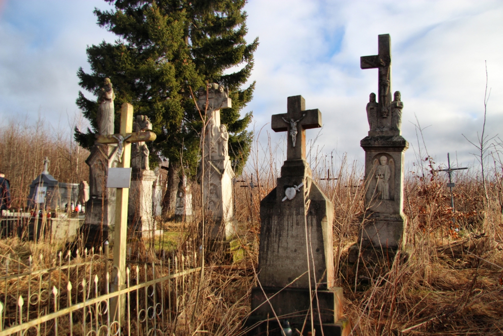 Від Залужан до польського кордону 50 кілометрів. Тут, як і в сусідніх селах намогильні хрести відрізняються, навіть від хрестів демнянської школи, хоча її вплив безумовно відчувається. Село Залужани досить давнє – перша згадка датується 1537 роком, коли королева Бона Сфорца викупила його у свою економію. Тоді (і до 1965 року) село називалося Татари. Від дуже давніх часів надгробків не збереглося – усі старі хрести датуються ХІХ та початком ХХ століття. Відмінною їх рисою є численні янголи, витесані монолітом, разом із хрестом, на раменах або під ними, або й так, і так. Деякі фігури, незважаючи на сільський наїв, витесані дуже майстерно.