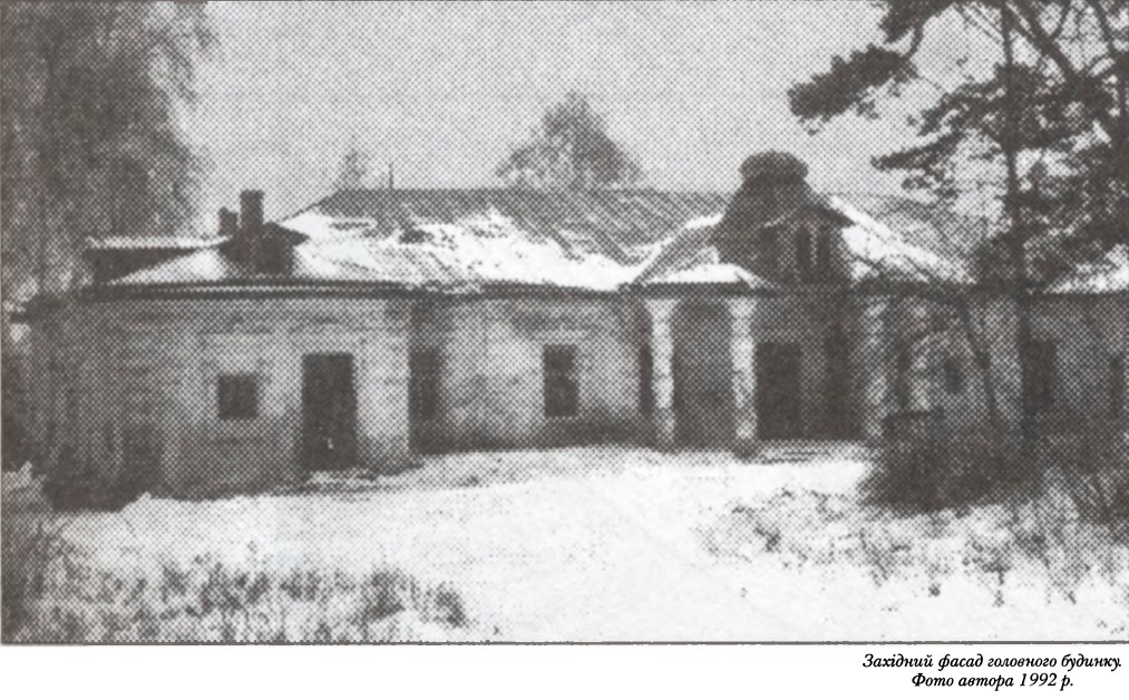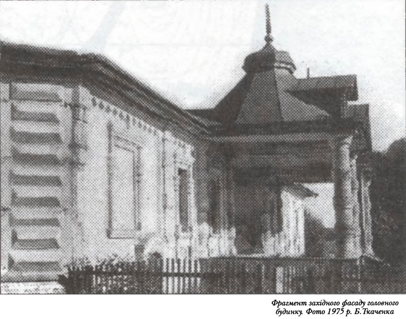 Головний будинок дерев’яний, на цегляному підмурку, зведений у 1830-х pp. Під південно-східним кутом є підвал, перекритий цегляним склепінням. У 1880-х pp. зовні його обклали цеглою (товщина обличкування в одну цеглину), зробивши водночас надбудови на даху (вежі й люкарни) і надавши пізньокласицистичній будівлі стильових рис французького неоренесансу.